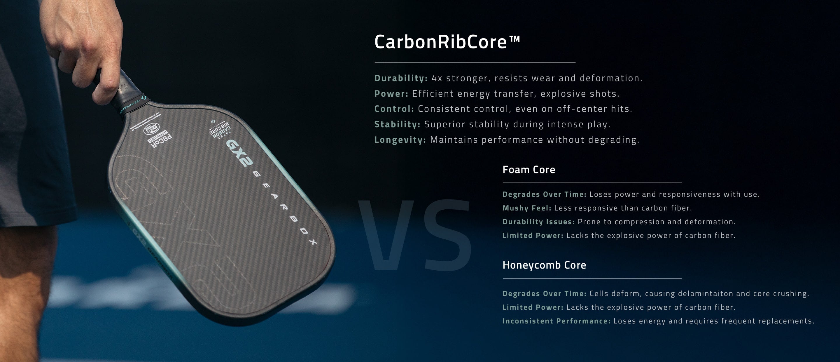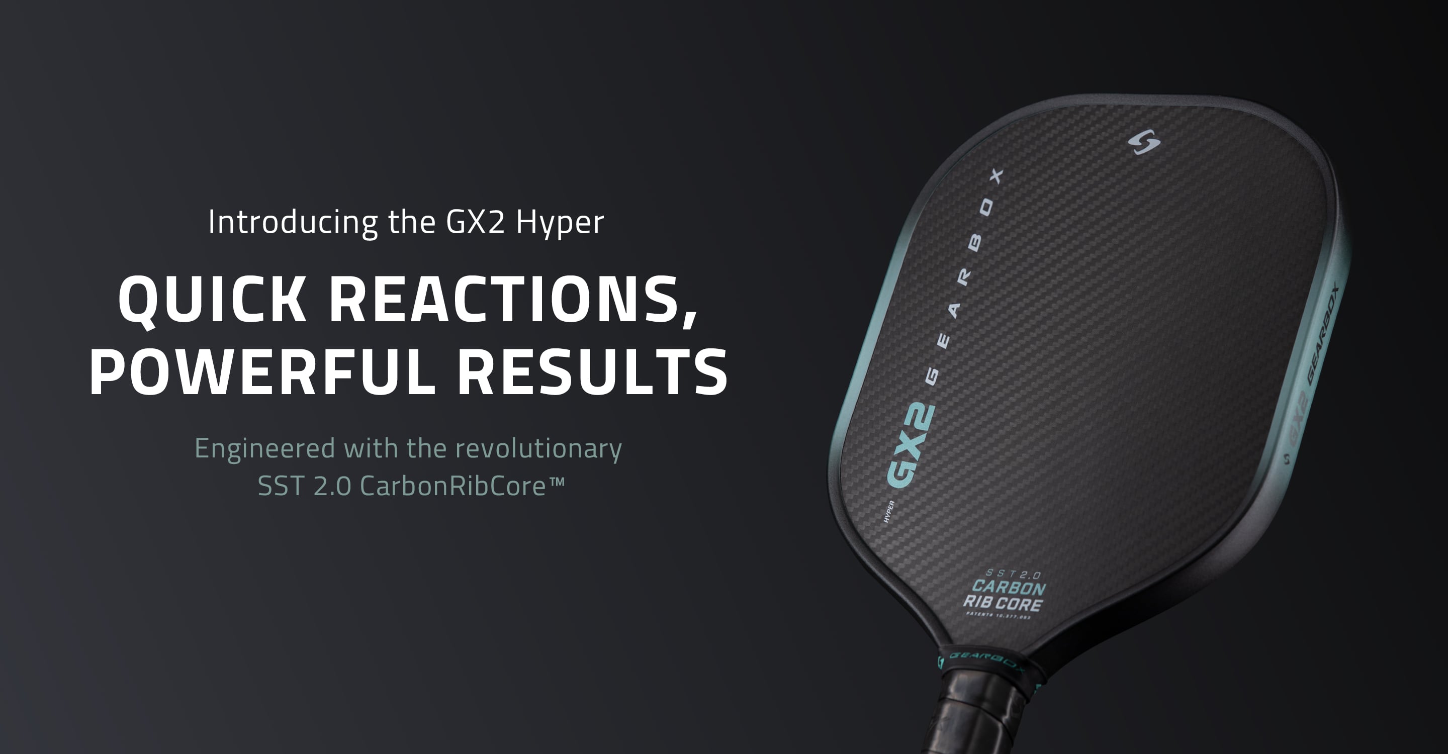 Introducing the GX2, powered by the revolutionary SST 2.0 CarbonRibCore™—the next generation of paddle technology. GX2 delivers exceptional power, consistent performance, and enhanced control, providing a responsive connection with every shot. While it may resemble a traditional honeycomb paddle at first glance, the GX2 is truly in a league of its own. Designed for unmatched stability and durability, it boasts four times the strength of traditional honeycomb cores and twice the strength of closed-cell foam paddles. The result is a paddle that seamlessly blends precision and power, maintaining the familiar honeycomb paddle feel, expanding the sweet spot, and enhancing carbon fiber strength for next-level performance.